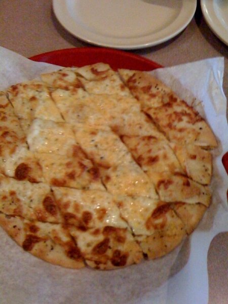 A small cheese and garlic pizza cut into diamond shape pieces.